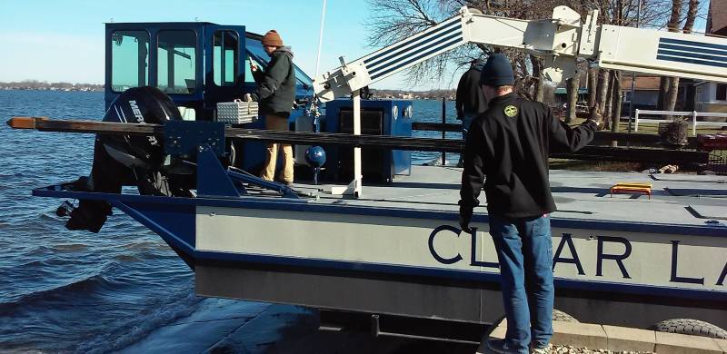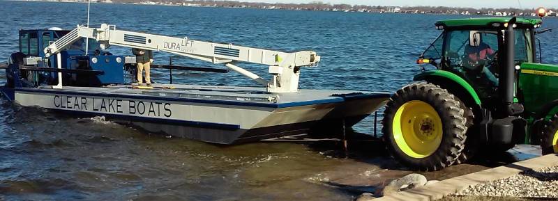 Clear Lake Boats offers barge service to remove and install your boat lifts. The barge has a 10 ton crane that reduces the possibility of damage to your boat lift as it gently places the boat lift on the barge's deck for transportation. We are the only service on Clear Lake using this technique; others cantilever the boat lift over the front of the barge during transportation. The crane also allows us to strategically place your boat lift anywhere near your dock or shoreline, as well as allowing us to easily adjust the legs and top to assure a level placement.